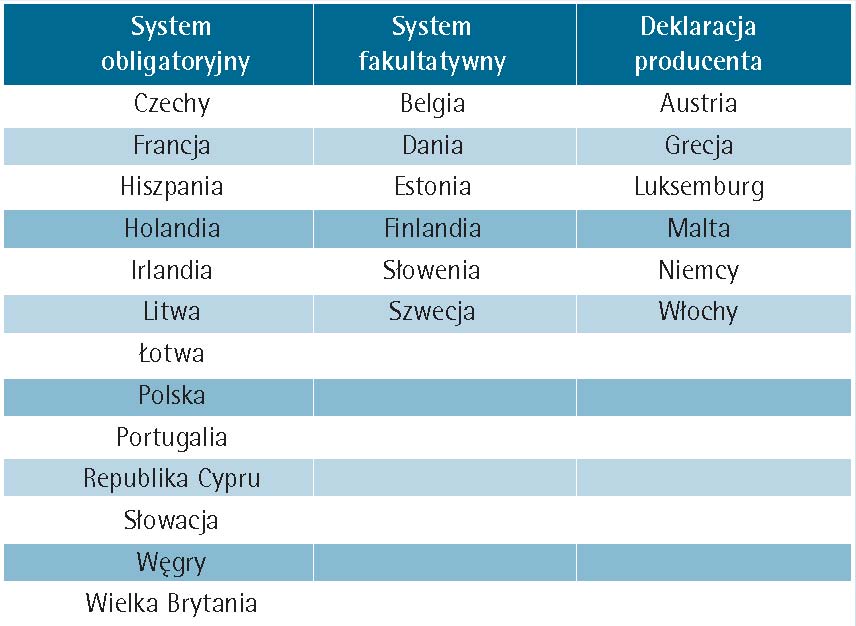 Podział krajów należących do Unii Europejskiej po 1 maja 2004 roku – na te trzy systemy – ilustruje poniższa tabela: