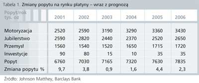 Do wzrostu cen i zapotrzebowania na platynę przyczyniły się przede wszystkim rosnące zamówienia przemysłu motoryzacyjnego, który w 2003 r. zużył 99,2 t (3,19 mln oz) platyny, tj. o 23% więcej niż w roku poprzednim. Tak znaczących wzrostów nie przewiduje się już w obecnym roku, jednak większość prognoz zakłada, iż zużycie w przemyśle motoryzacyjnym będzie wyższe niż w jubilerstwie, co po raz pierwszy miało miejsce w 2003 r. (tab. 1.). Potwierdzeniem takiego stanu na rynku są przepisy prawne dotyczące stosowania katalizatorów w samochodach, które wyraźnie się zaostrzają w wielu krajach, np. w USA obecnie istnieją bardziej restrykcyjne przepisy w wybranych stanach (np. Kalifornia, Nowy Jork, Vermont) oraz bardziej liberalne w pozostałych (zwane US Federal Standard), a przewiduje się, iż do 2009 r. we wszystkich stanach będą takie, jak obecnie w tych najbardziej restrykcyjnych.