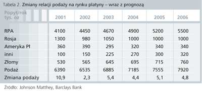 Długoterminowe prognozy opracowane na podstawie analizy rynku platyny są bardzo optymistyczne i zakładają zarówno wzrost jej popytu, np. w 2005 r. o 4,4%, wzrost podaży, np. w 2005 r. o 5,1% , jak i utrzymanie się cen na stosunkowo wysokim poziomie. Jednak wiele zależeć będzie od skutecznego wprowadzenia planowanych przepisów prawnych w zakresie ograniczenia emisji, opracowania nowych technologii, jak również podaży i zmian dokonujących się na rynku palladu i rodu, które przynajmniej w przemyśle motoryzacyjnym (obecnie 37% podaży platyny, 62% palladu i 87% rodu konsumowane jest w przemyśle motoryzacyjnym) zaczynają być skutecznymi substytutami.